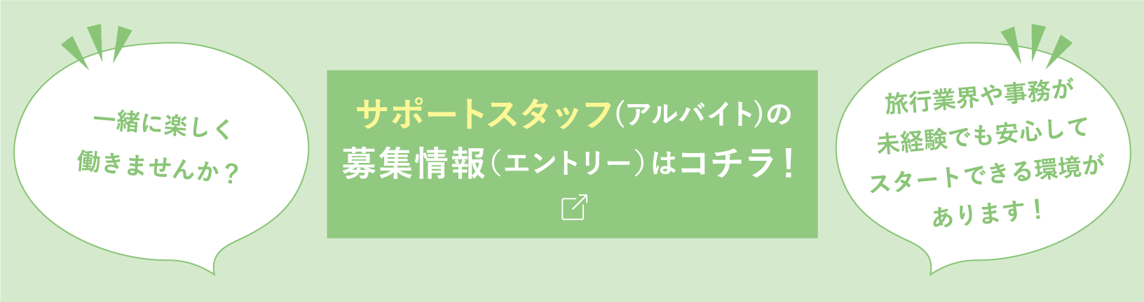 阪急トラベルサポートでは、アルバイトとして国内・海外旅行にお申込みされたお客様のご出発までの後方業務をサポートするスタッフをサポートスタッフと呼んでいます。現在多数のサポートスタッフが活躍中。大半が旅行業界未経験から始められ、事務のお仕事が初めてという方でも、経験を積み正社員へとステップアップしていく場合もあります。 皆さんも、阪急トラベルサポートの一員として一緒に働きましょう!
